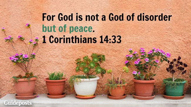 Perhaps Ecclesiastes 3:6, “a time to search and a time to give up, a time to keep and a time to throw away.” Or 1 Corinthians 14:33, “For God is not a God of disorder but of peace.”
