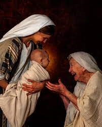 There is so much that is left unsaid in this Bible quote. I chose the graphic below because it shows three very happy people. Mary, smiling and holding her laughing son, introduces him to an ecstatic Anna, who, like all of us when we meet a new baby, reaches out her hands to hold and cuddle the baby. Her long life of waiting has been fulfilled. The Christ is here in her presence, and she couldn’t be more excited.